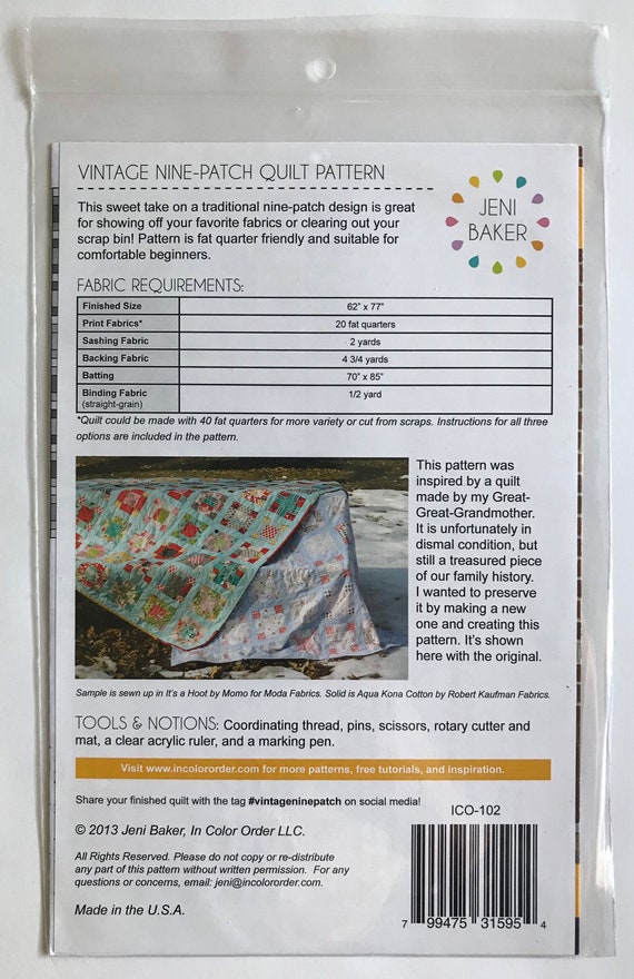 Vintage Nine Patch Quilt Sewing Pattern By Jeni Baker Fat Etsy